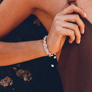 Pulsera de eslabones dorados y plateados con cierre de barra en forma de Omega, en fondo blanco.