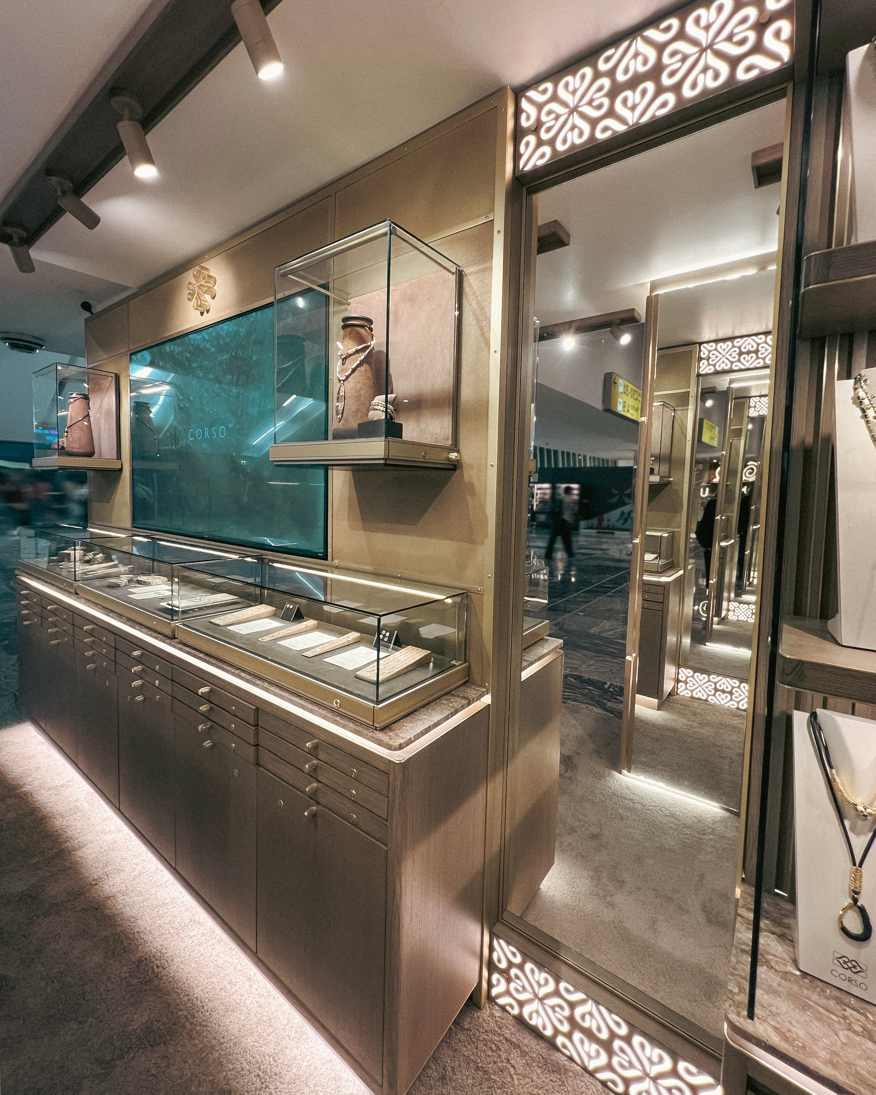 In this space, every detail has been designed to reflect Corso's DNA. Clean lines, taupe tones, golden accents, and surfaces in quartzite and travertine create a warm and contemporary atmosphere. The brand’s monogram is subtly integrated into the walls and textiles, evoking continuity and belonging. The presence of brass and natural stone emphasizes the material precision that defines our pieces and their narrative.